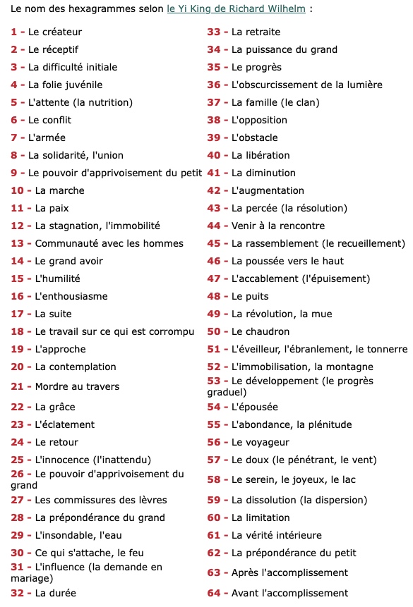 Notre code génétique est semblable aux trigrammes inférieur et supérieur des hexagrammes. Il existe 64 codons dans notre code génétique, tout comme il existe 64 hexagrammes dans le I Ching.