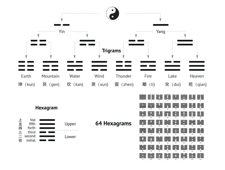 Le Livre des changements (Yi jing) est un corpus de divination de la Chine antique. La base de son système divinatoire repose sur les célèbres huit trigrammes. Chacun étant composé d’une combinaison de trois lignes superposées soit continues, soit discontinues. La combinaison de deux trigrammes donne donc des hexagrammes dont les possibilités combinatoires donnent soixante-quatre variantes.